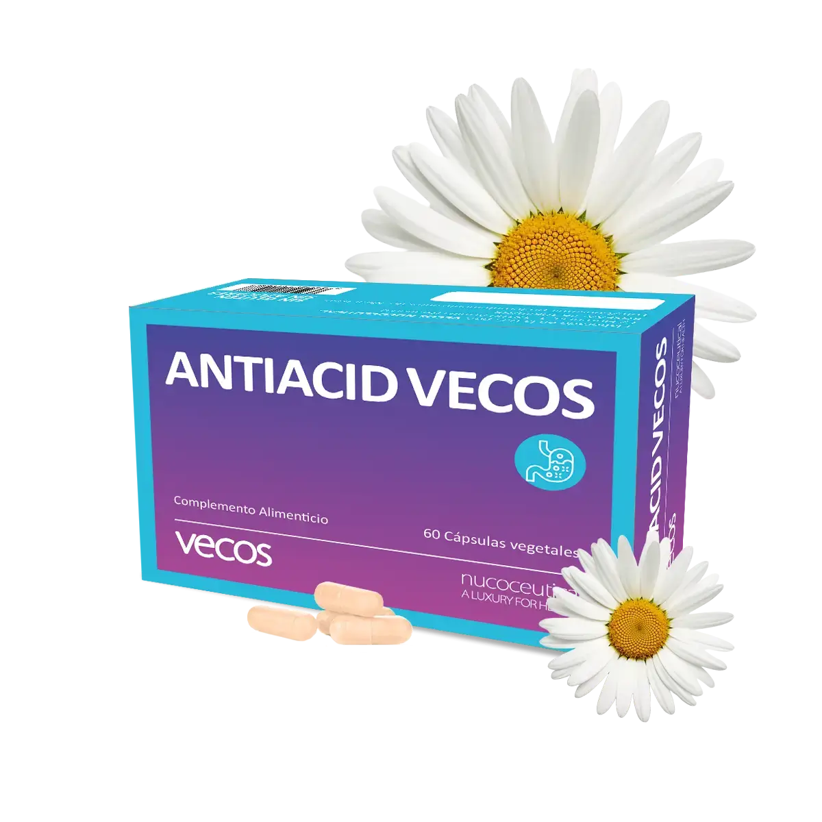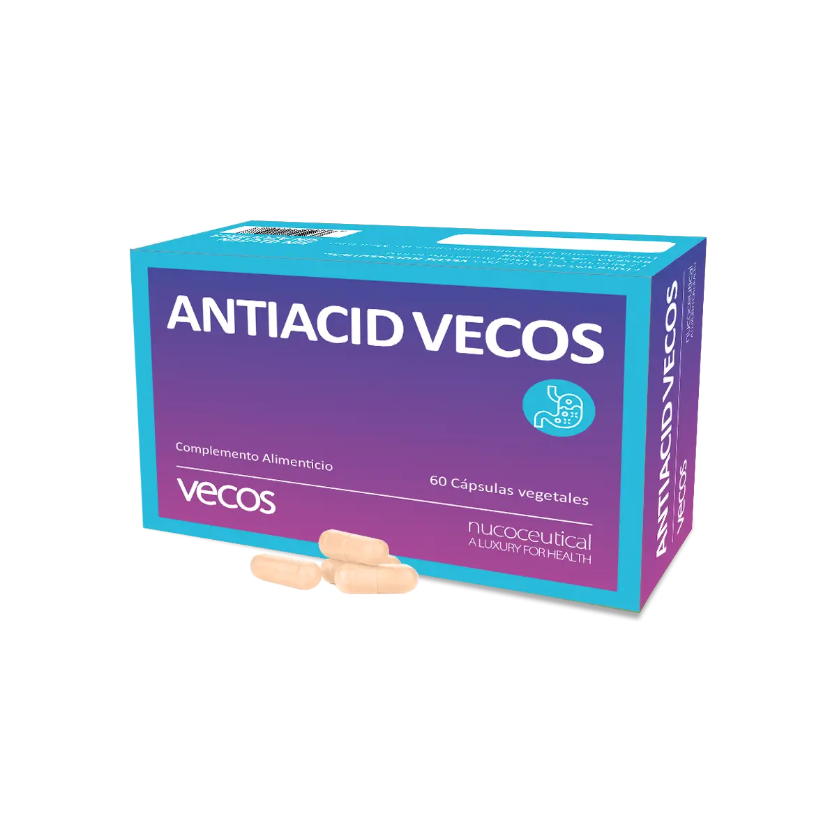 Antiacid Vecos es un complemento alimenticio formulado con Carbonato de calcio, que contribuye al funcionamiento normal de las enzimas digestivas; y extractos secos de plantas tales como el Aloe Vera, el Hinojo y el extracto seco de Regaliz, que contribuye a favorecer la digestión.