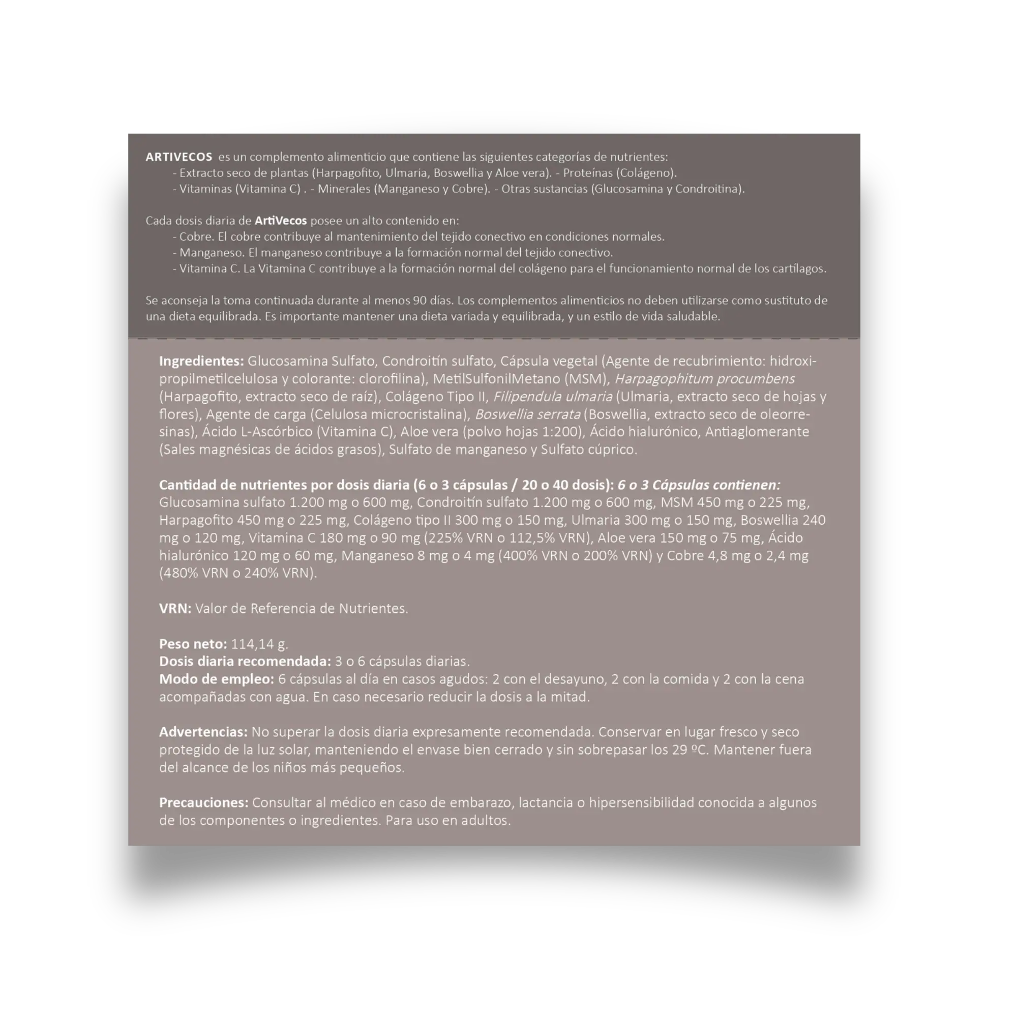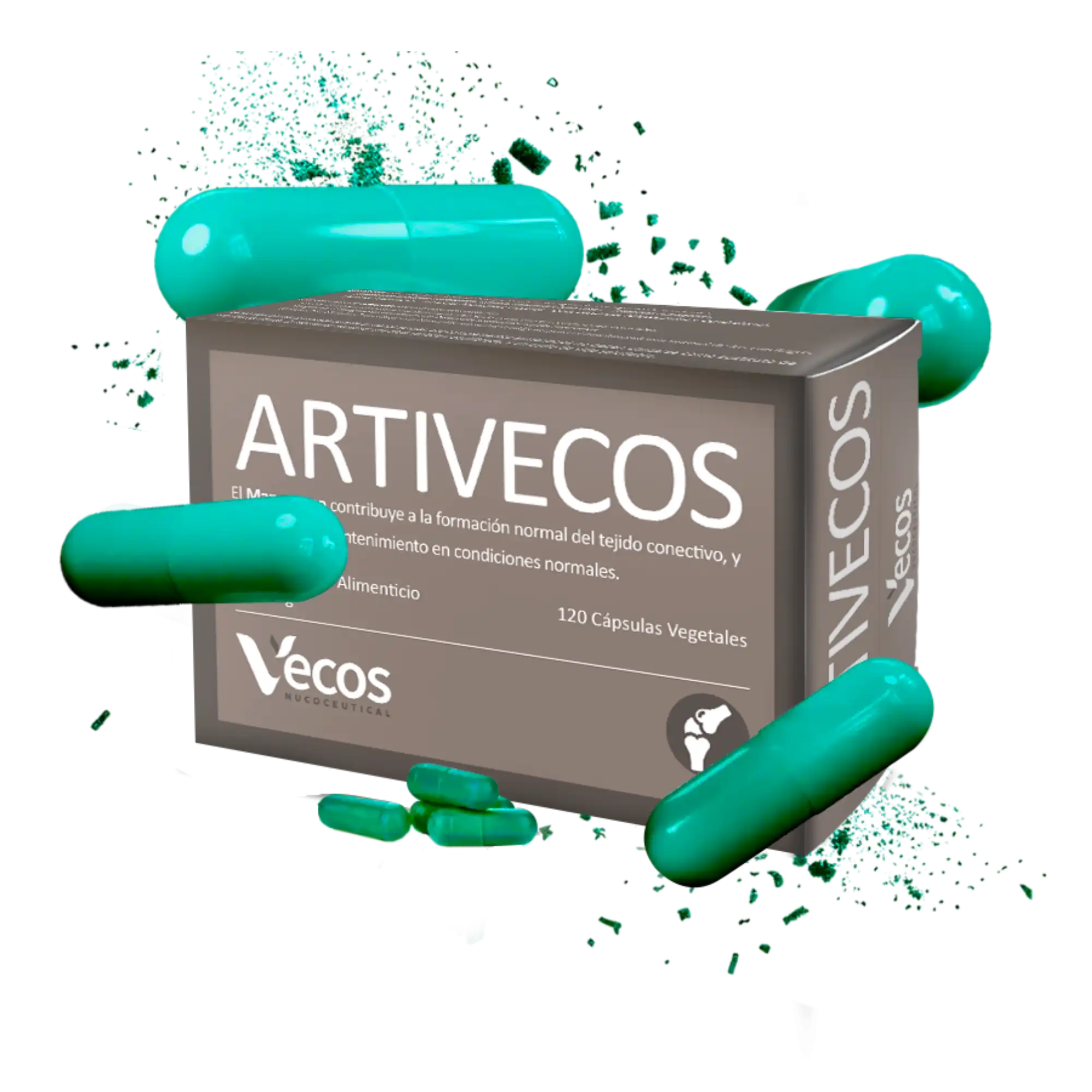 Artivecos es un complemento alimenticio en cápsulas vegetales que combina ingredientes activos tales como Glucosamina, Condroitín, MSM (MetilSulfonilMetano), Harpagofito, Colágeno Tipo II, Ulmaria, Boswellia, Vitamina C (Ácido L-ascórbico), Aloe vera, Ácido hialurónico, Manganeso y Cobre.