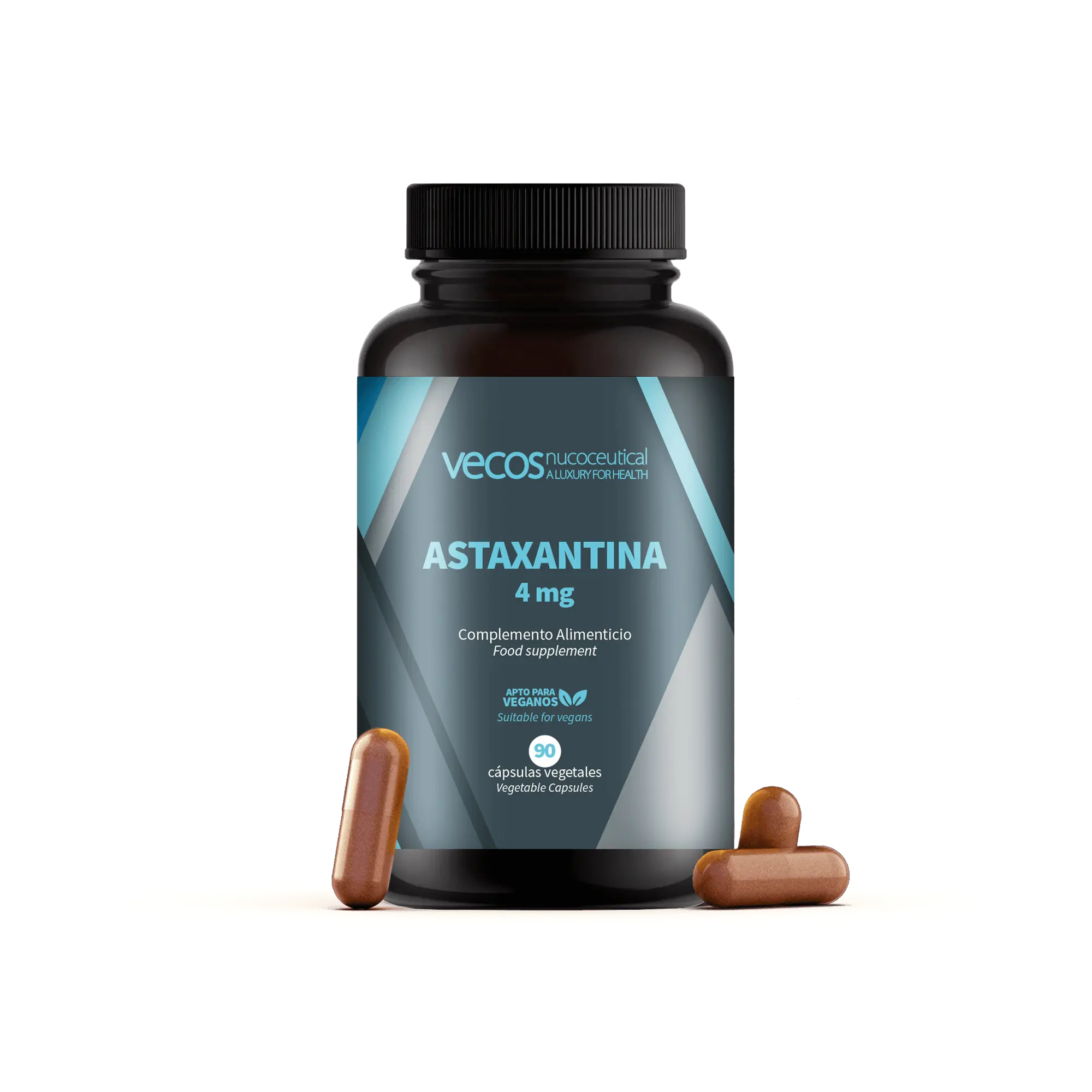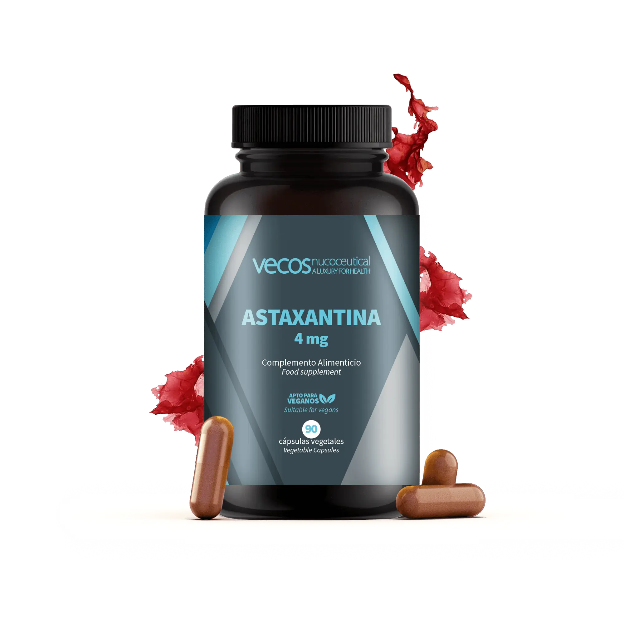 Astaxantina Vecos es un complemento alimenticio, en cápsulas vegetales, formulado a partir de la microalga Haematococcus pluvialis.