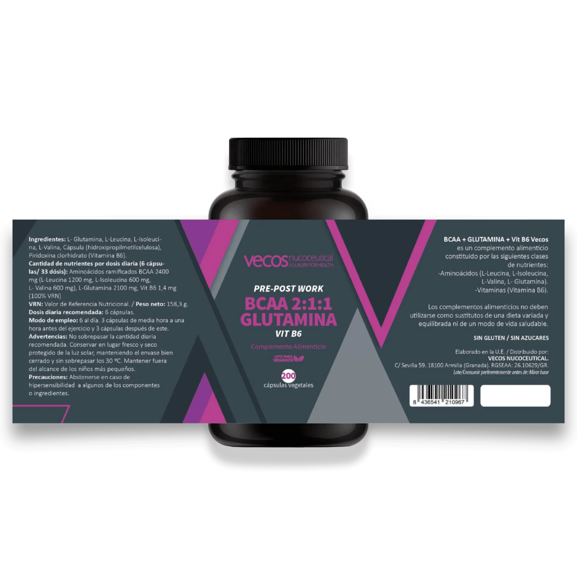 BCAA + Glutamina + Vit. B6 es un suplemento deportivo en cápsulas que combina aminoácidos ramificados (BCAA con una proporción de 2:1:1 (Leucina , Isoleucina, Valina)), L-Glutamina y Vitamina B6.