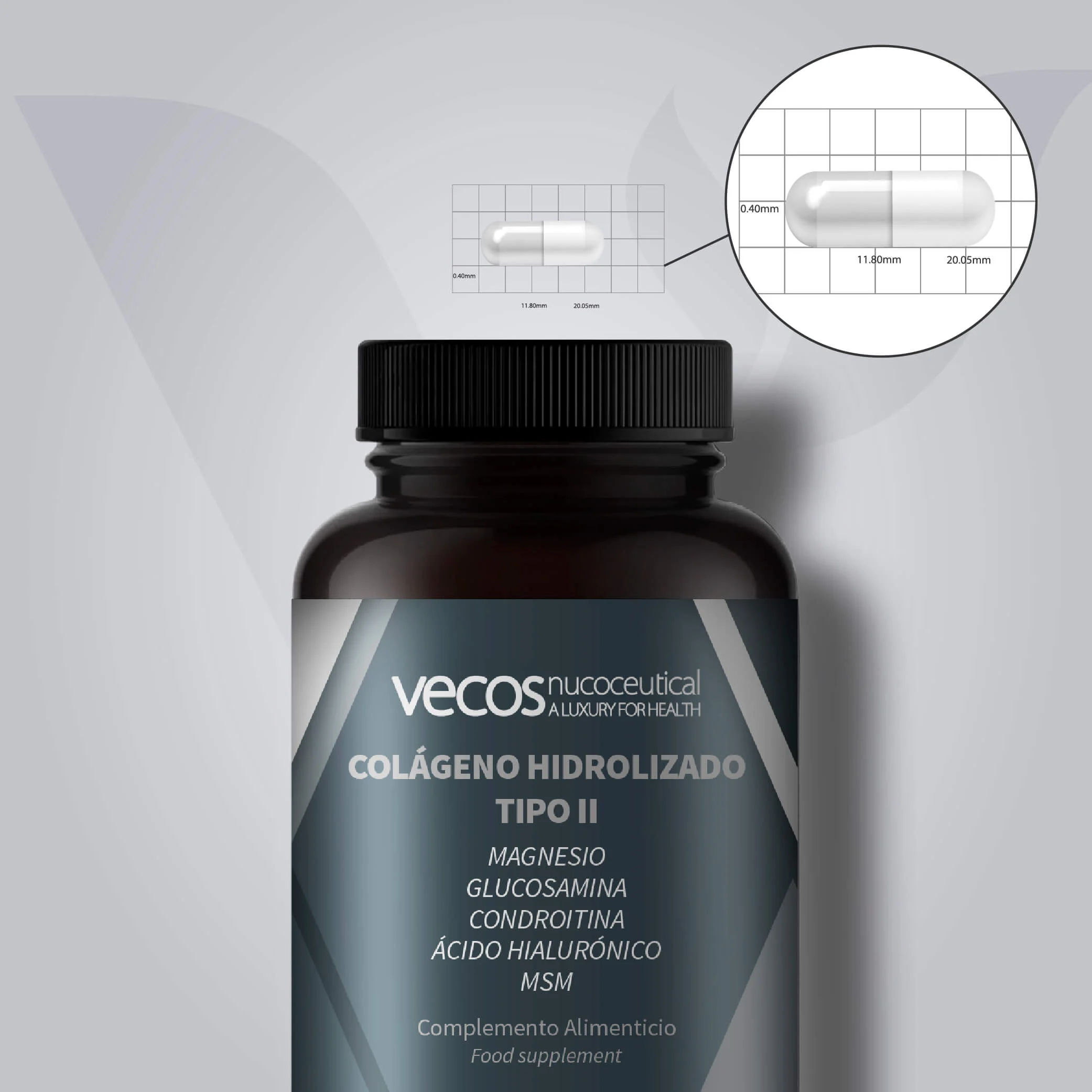 El Colágeno Hidrolizado Tipo II de Vecos es un complemento alimenticio que contiene en su fórmula Vitamina C, que contribuye a la formación normal de colágeno para el funcionamiento normal de los huesos, de los cartílagos y de los vasos sanguíneos; y Magnesio, que contribuye al funcionamiento normal de los músculos.