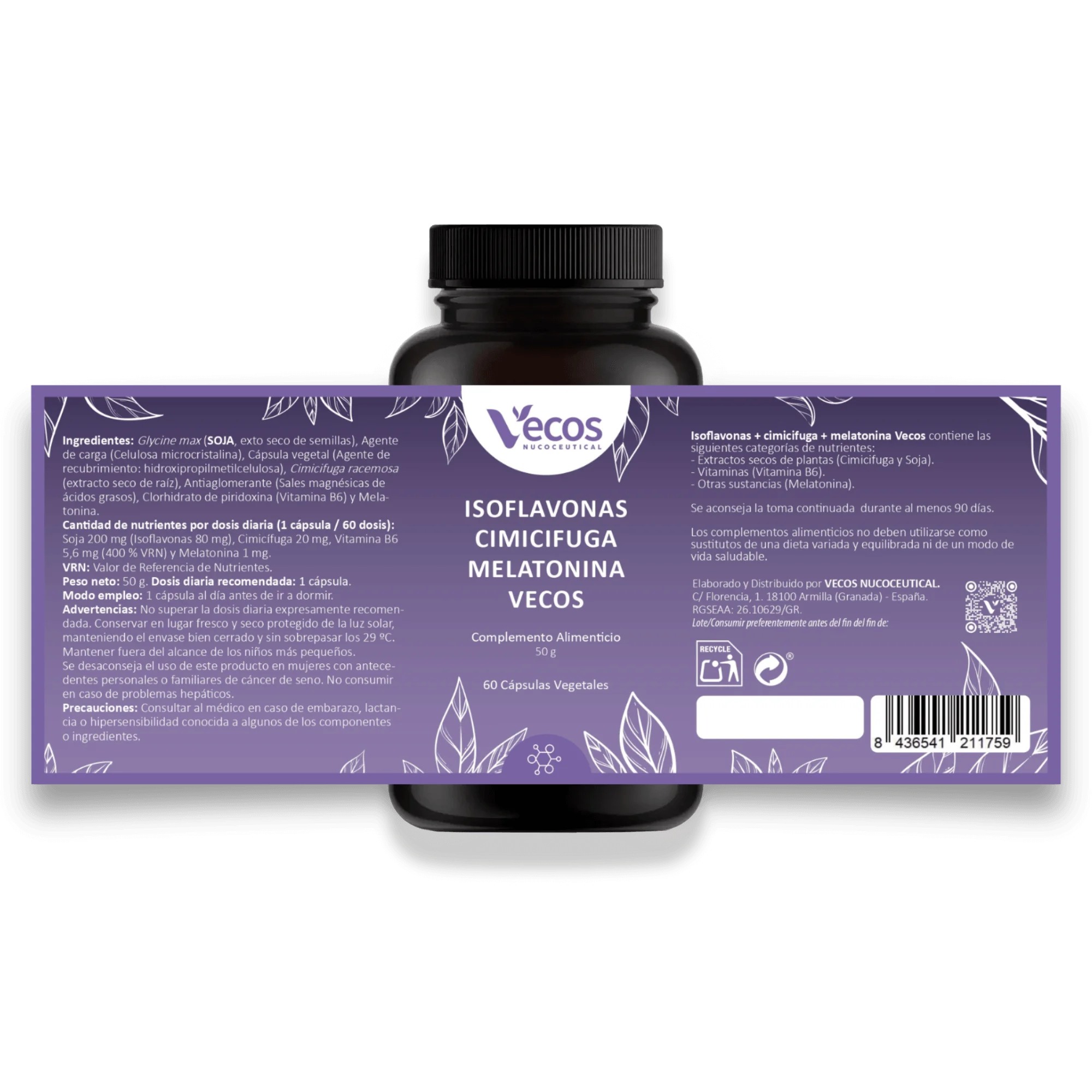 Isoflavonas Cimicifuga Melatonina Vecos es el complemento perfecto que combina las Isoflavonas de Soja con la eficacia de la Cimicifuga, que ayuda a mantener una menopausia tranquila y cómoda, y la Melatonina*, que contribuye a disminuir el tiempo necesario para conciliar el sueño.