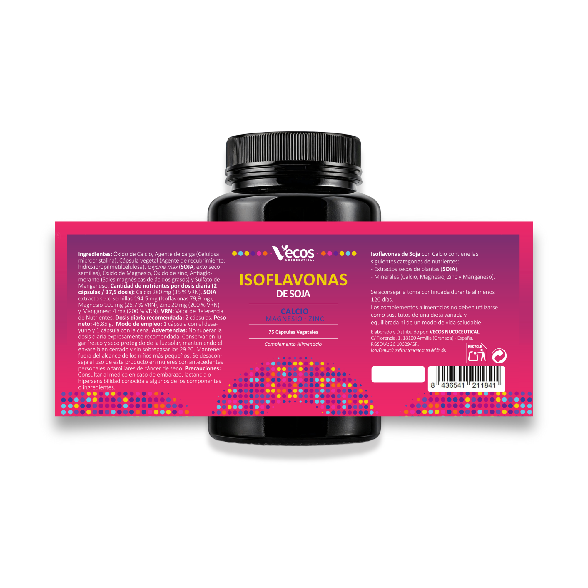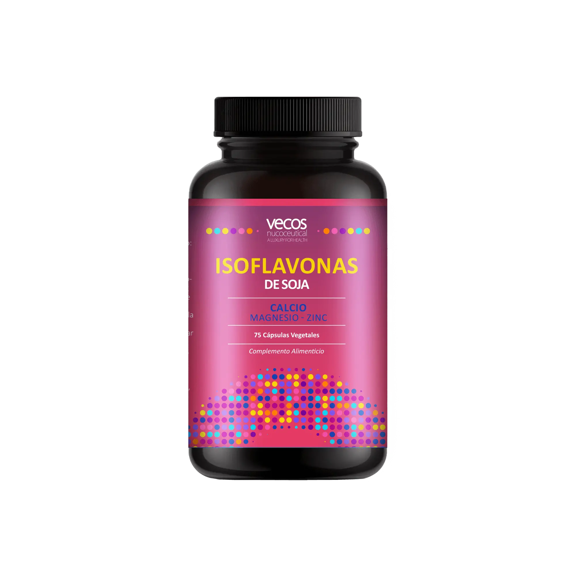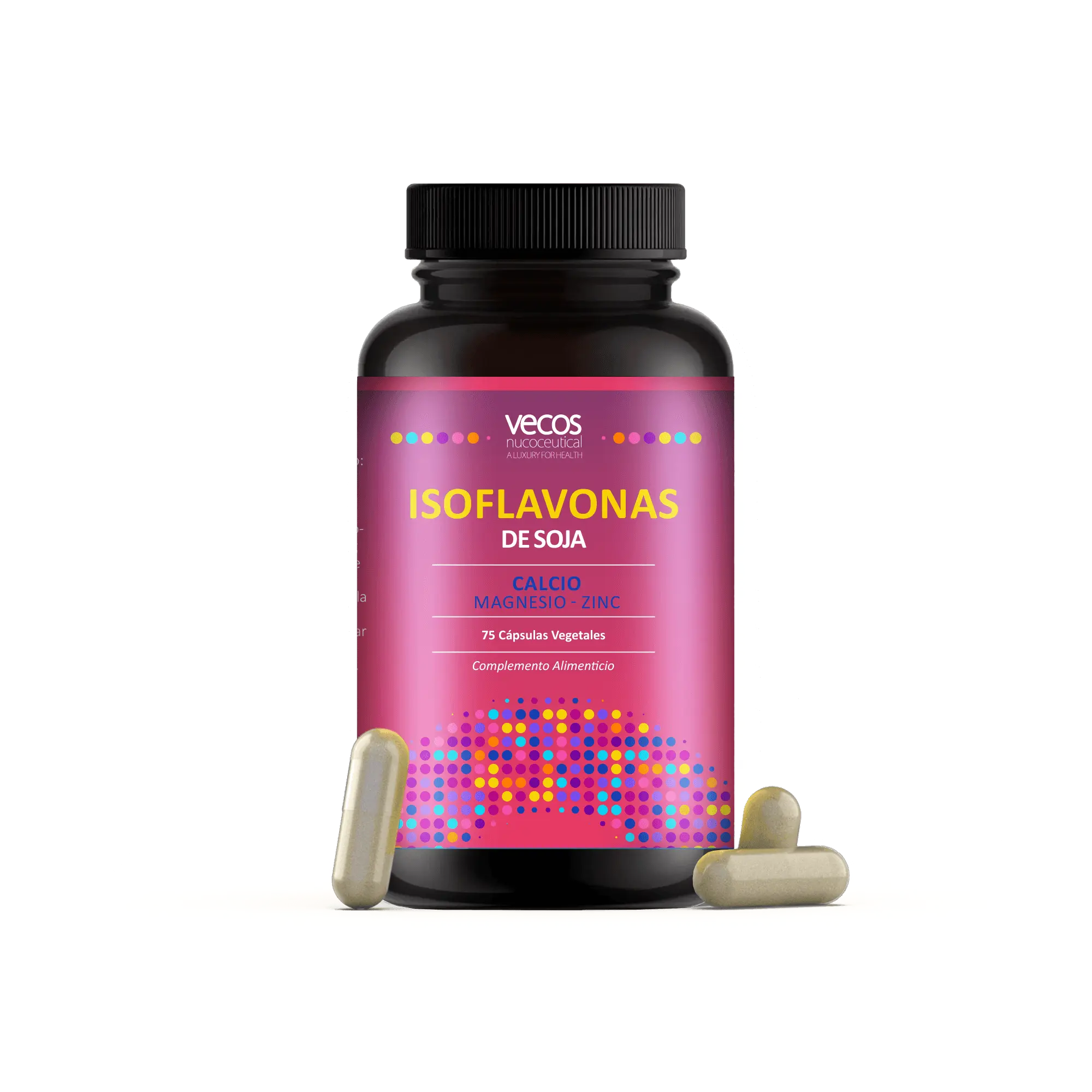 Las Isoflavonas de Soja de VECOS son un complemento alimenticio avanzado, creado específicamente para contribuir al mantenimiento de los huesos en condiciones normales, gracias al Calcio, el Magnesio, el Zinc y el Manganeso; al funcionamiento normal de los músculos, gracias al Calcio y el Magnesio; contribuir también a una función psicológica normal, gracias al Magnesio y a la protección de las células frente al daño oxidativo, gracias al Manganeso.