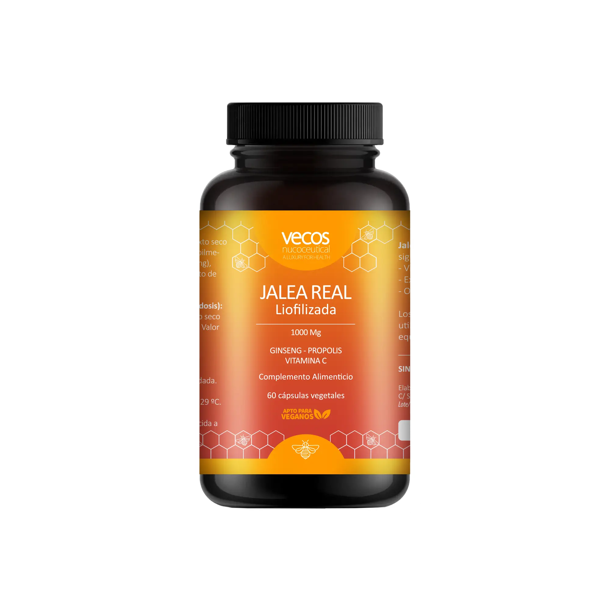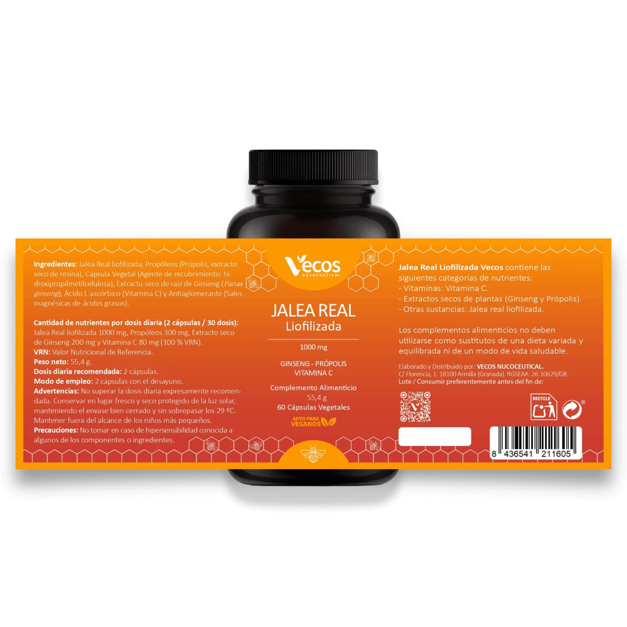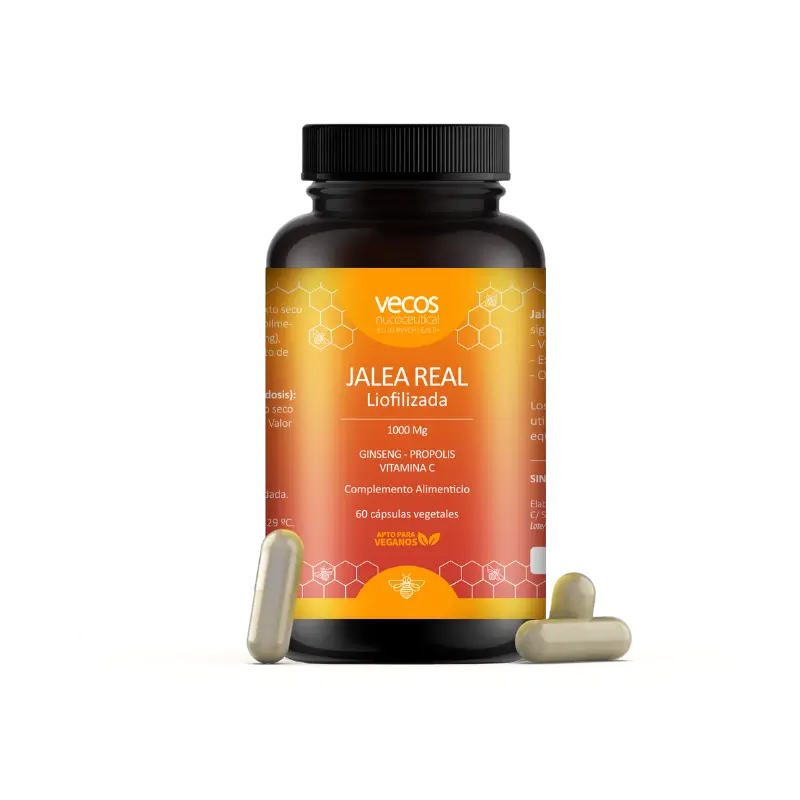 Jalea Real Liofilizada de VECOS es un complemento alimenticio natural elaborado con Jalea Real Liofilizada, Propóleos, extracto seco de Ginseng y Vitamina C.