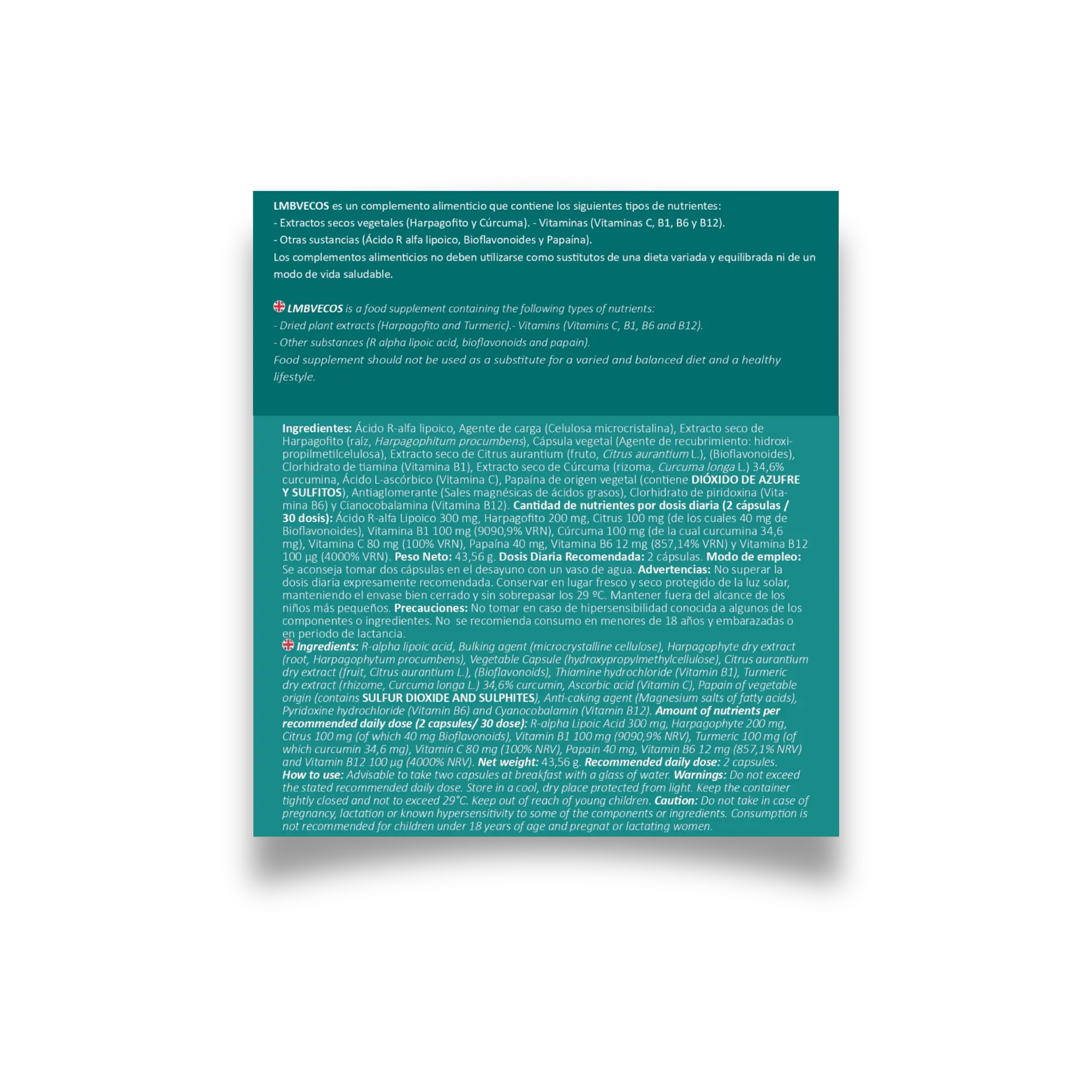 LMBVECOS es un complemento alimenticio que se distingue por su composición única de Ácido R-alfa Lipoico, Harpagofito, Citrus aurantium, Cúrcuma, Papaína, Vitamina B1, Vitamina B6, Vitamina B12 y Vitamina C.