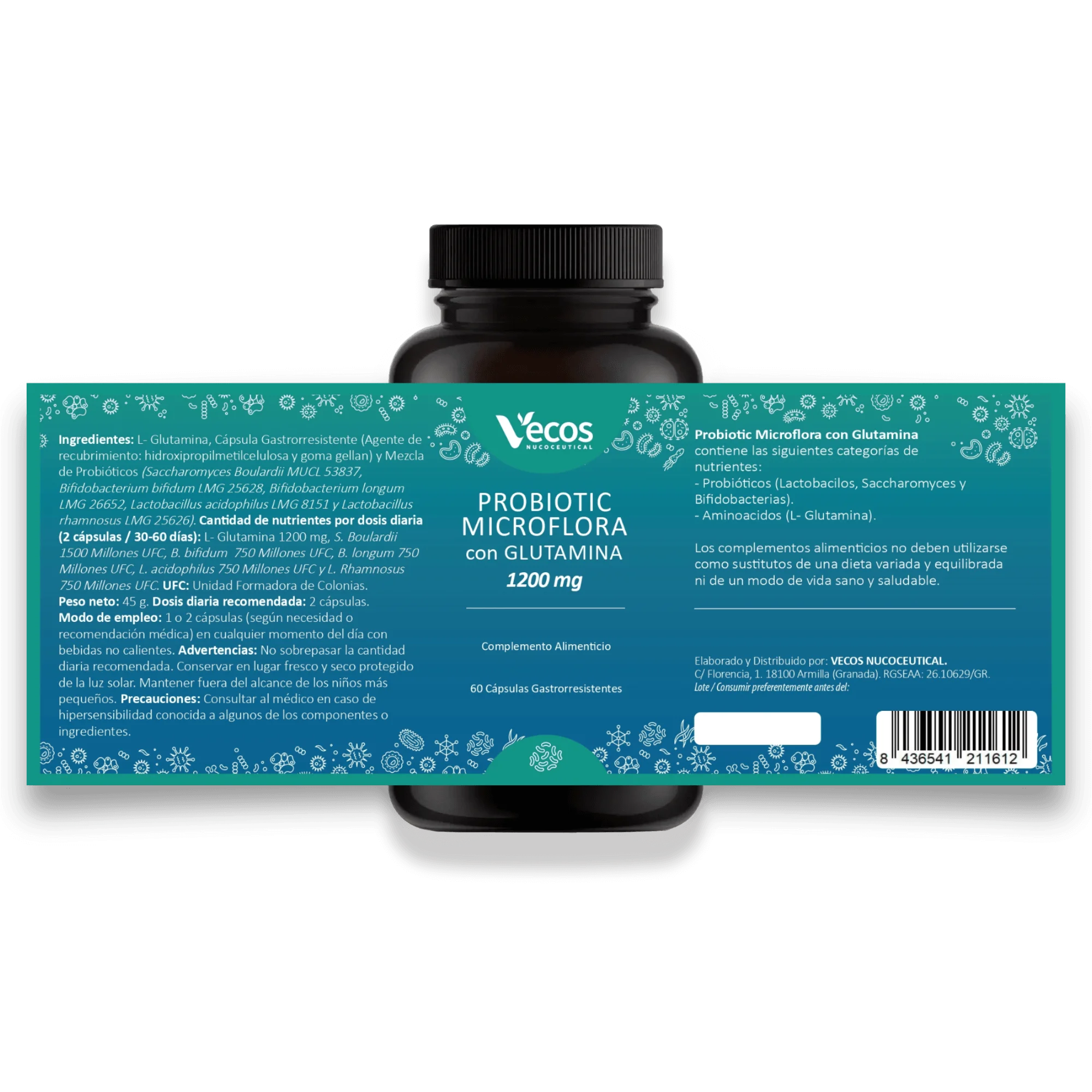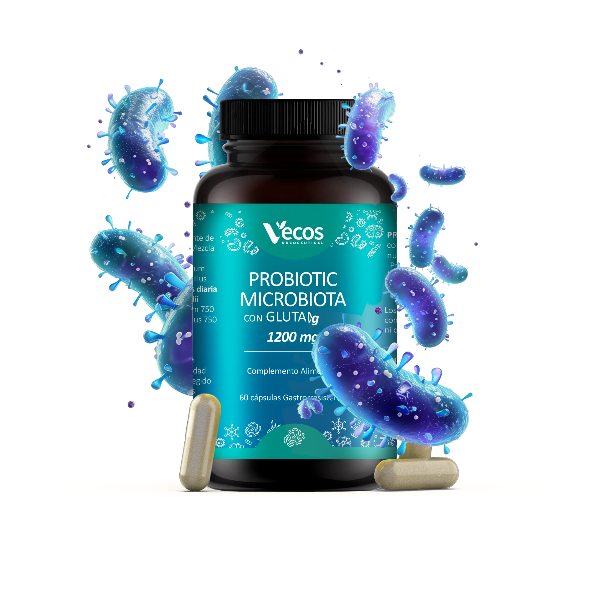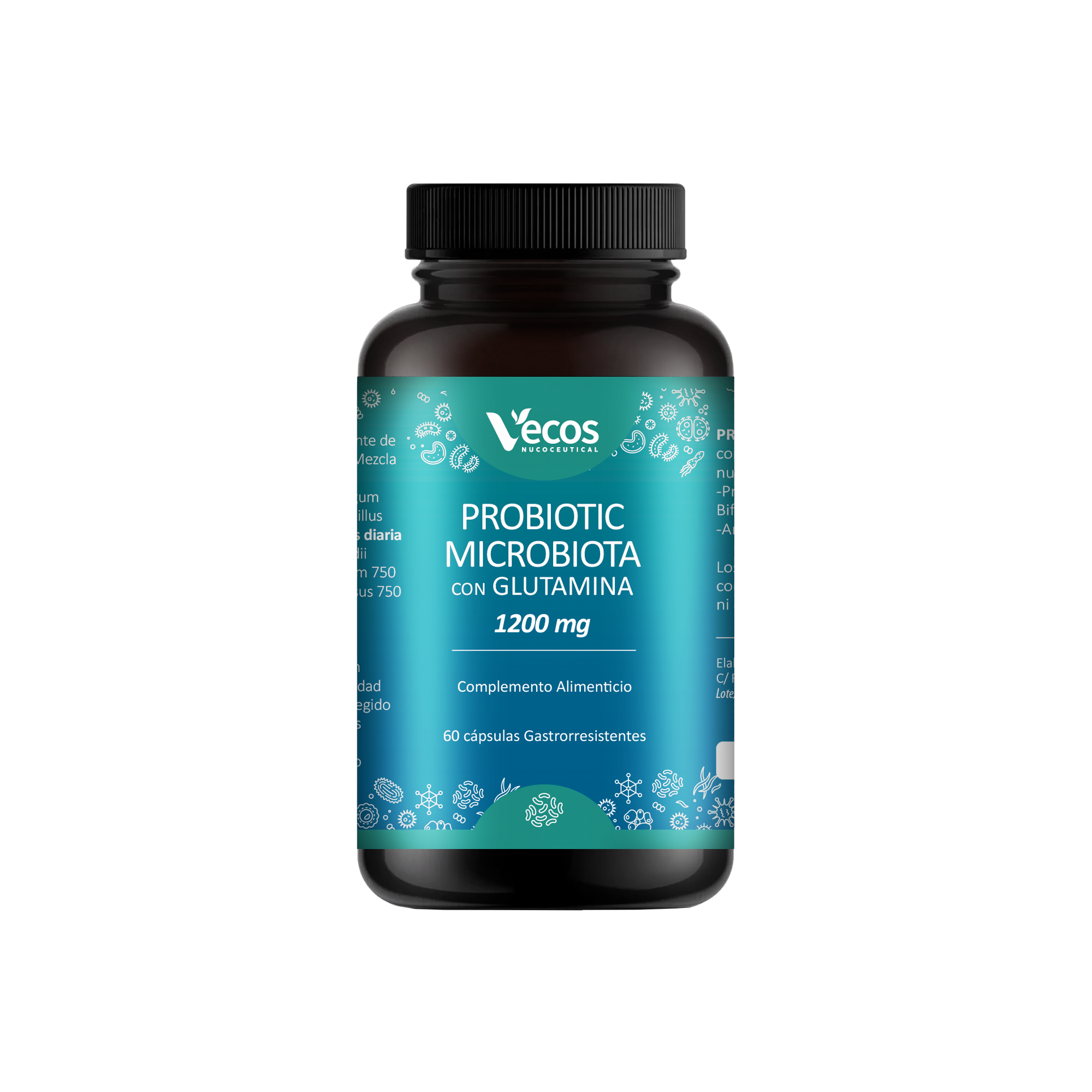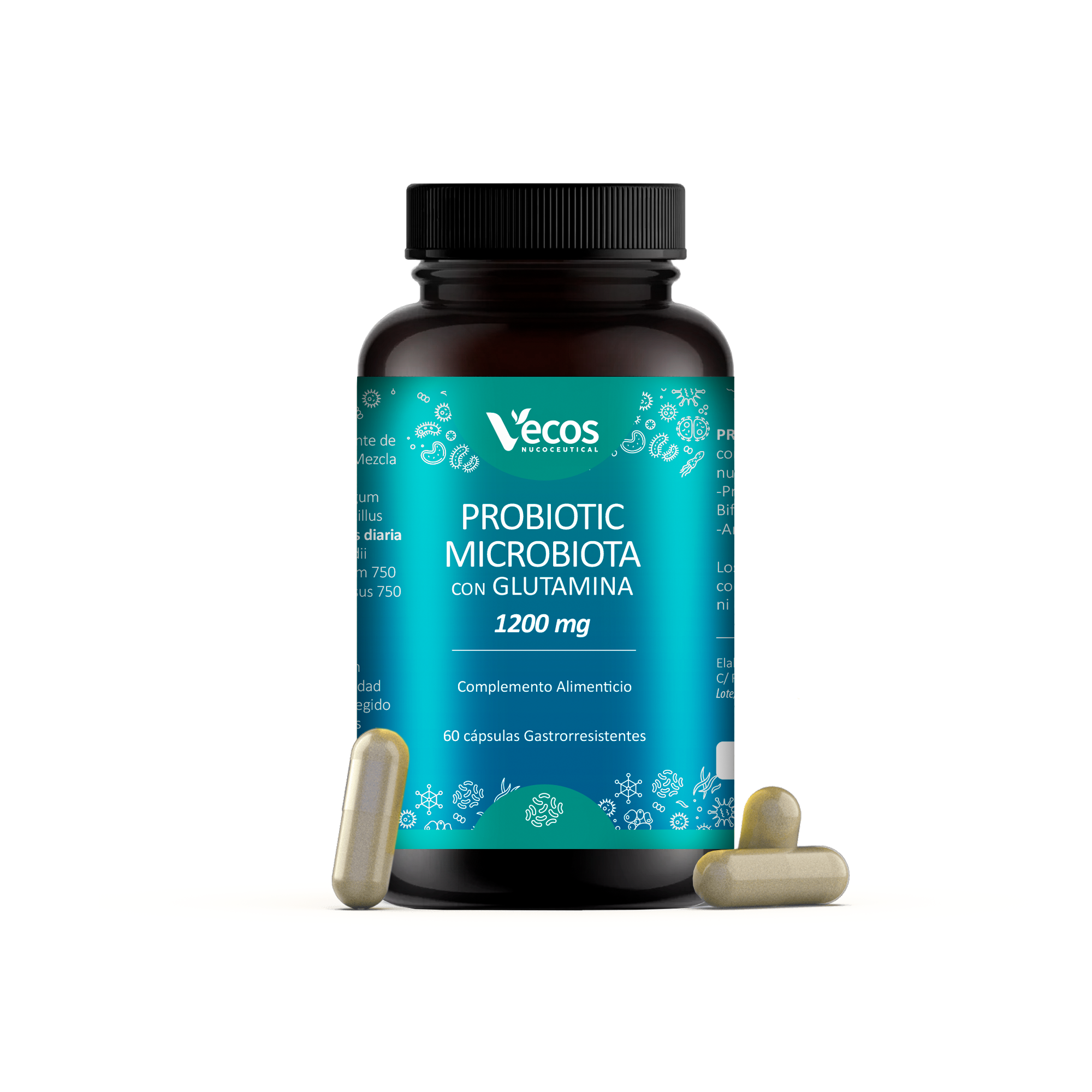 Probiotic Microflora con Glutamina 1200 mg de Vecos es un complemento alimenticio con 60 cápsulas gastrorresistentes que contienen Probióticos y L-Glutamina.