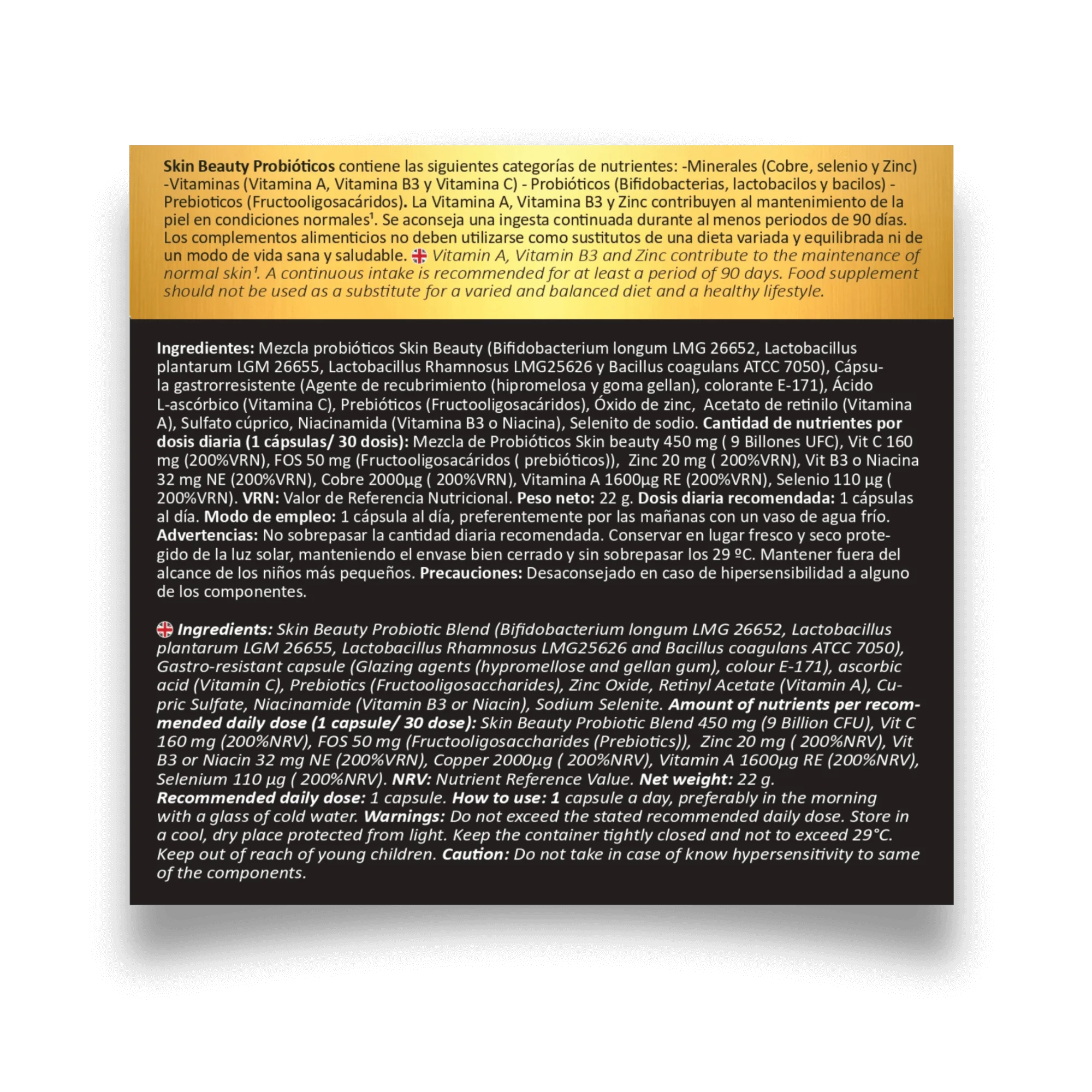 Skin Beauty Probióticos es un suplemento alimenticio elaborado con Mezcla de Probióticos Skin beauty, Vitamina C, Prebióticos,  Zinc, Vitamina B3, Cobre, Vitamina A y Selenio.