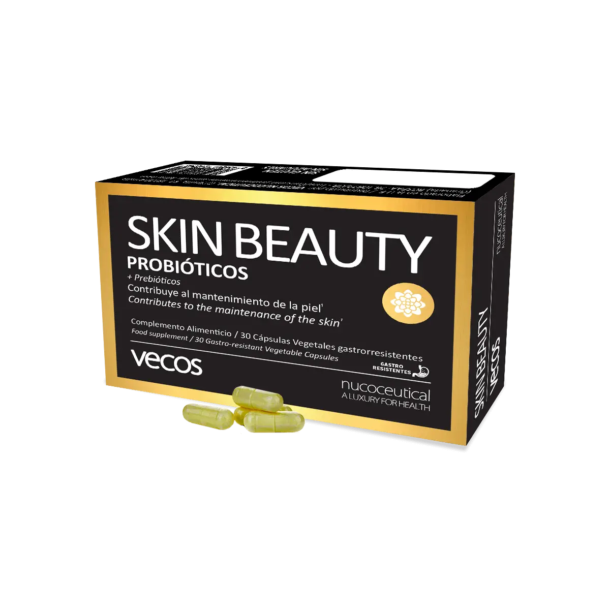 Skin Beauty Probióticos de VECOS, un complemento alimenticio con una fórmula avanzada que combina probióticos, prebióticos, minerales y vitaminas como Vitamina A y C, que contribuyen a la protección de las células frente al daño oxidativo y promueve una piel saludable y revitalizada.