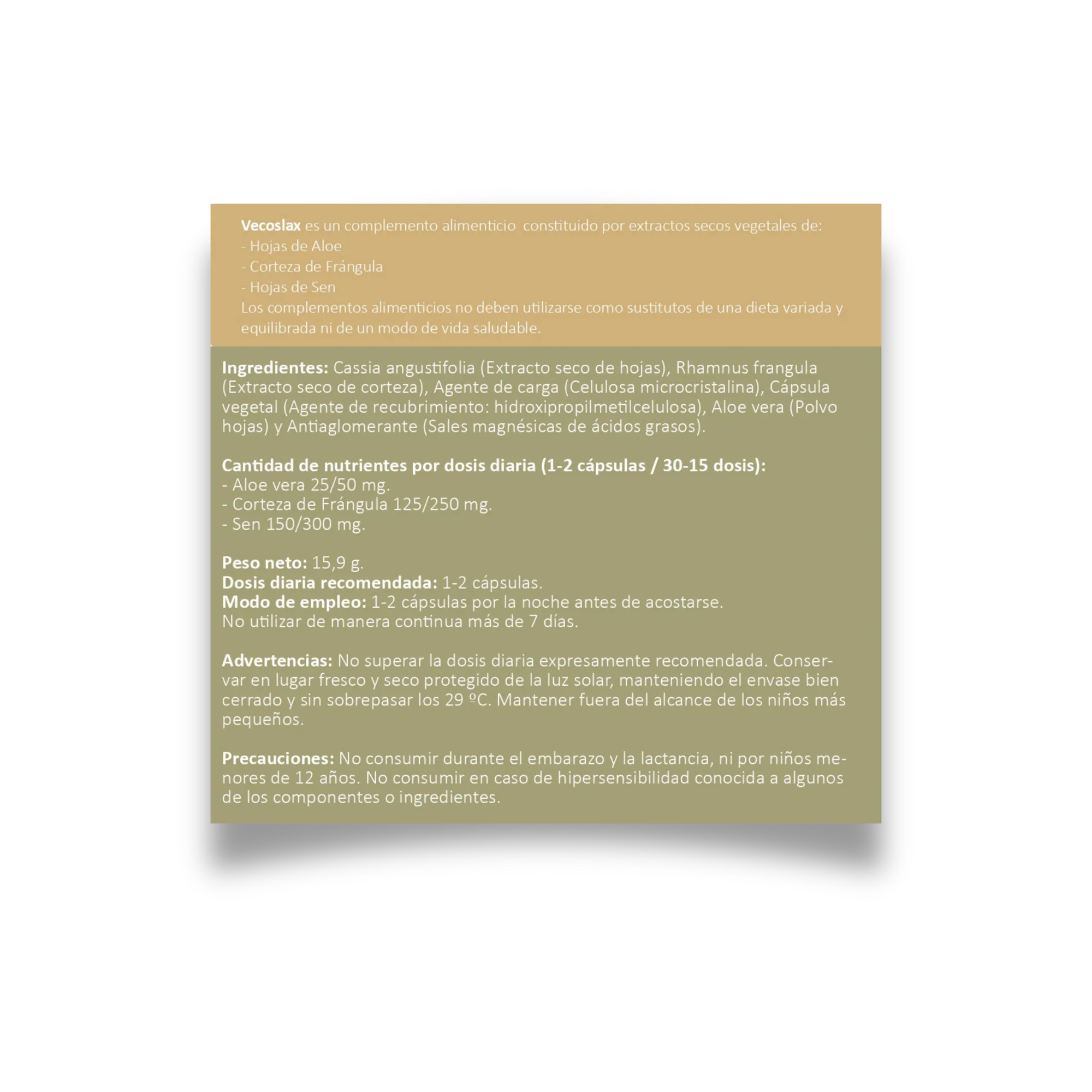 VECOSLAX es un complemento alimenticio elaborado con Aloe Vera, Extracto Seco de Frángula y Extracto Seco de Sen.