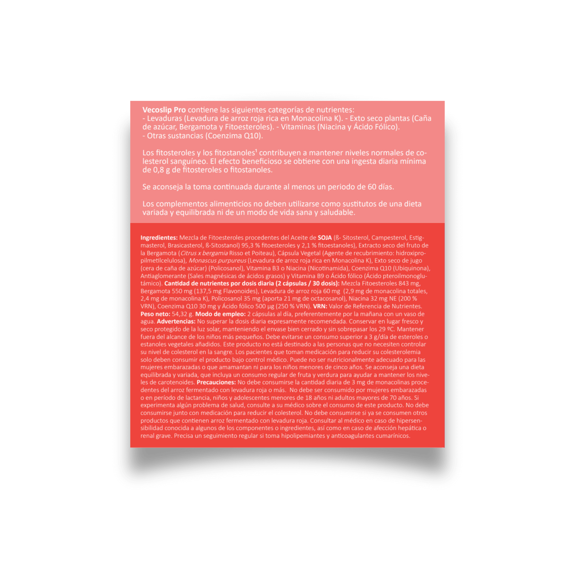 Vecoslip Pro es un complemento alimenticio formulado con una mezcla de Fitoesteroles, Niacina, Coenzima Q10, Ácido fólico y extractos secos de Bergamota, Levadura de arroz roja y Caña de azúcar.