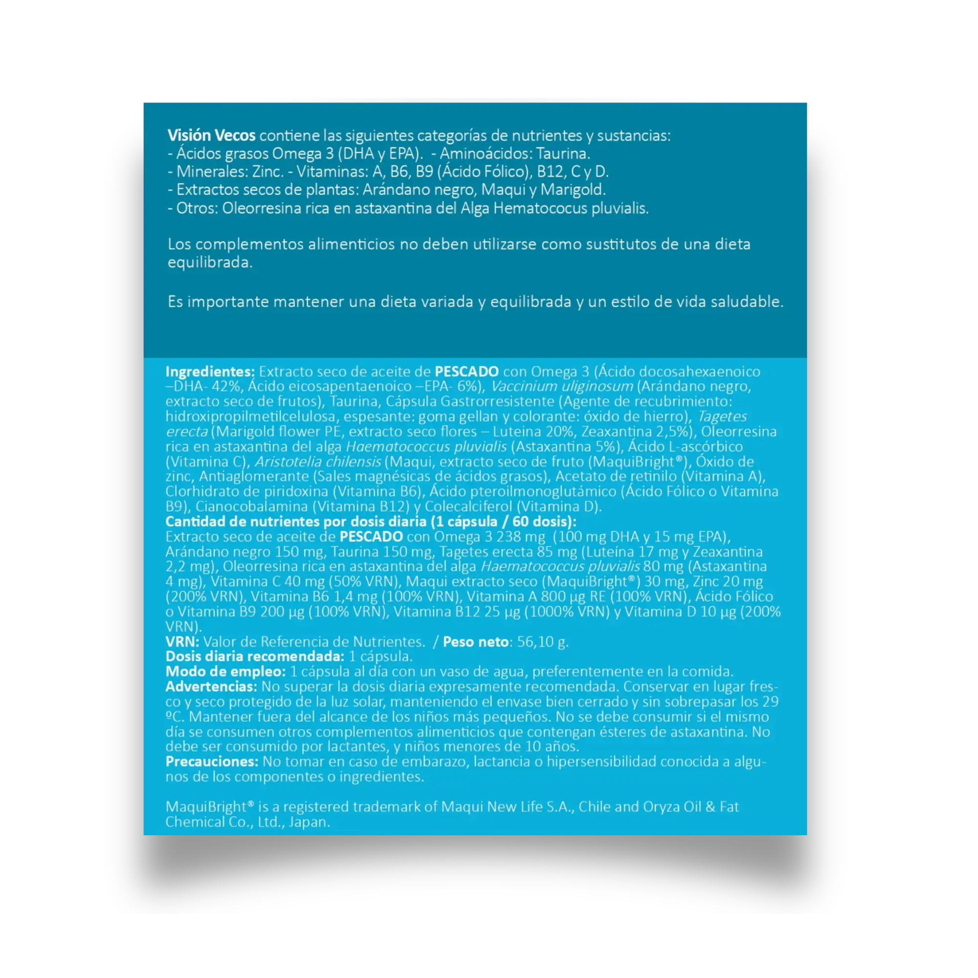 Visión VECOS es un complemento revolucionario indicado para el bienestar de la visión en cuya composición se encuentran extractos naturales, aceite de pescado, Maquibright® y luteína; además de otros ingredientes como el Zinc y la Vitamina A, que contribuyen ambos al mantenimiento de la visión en condiciones normales.