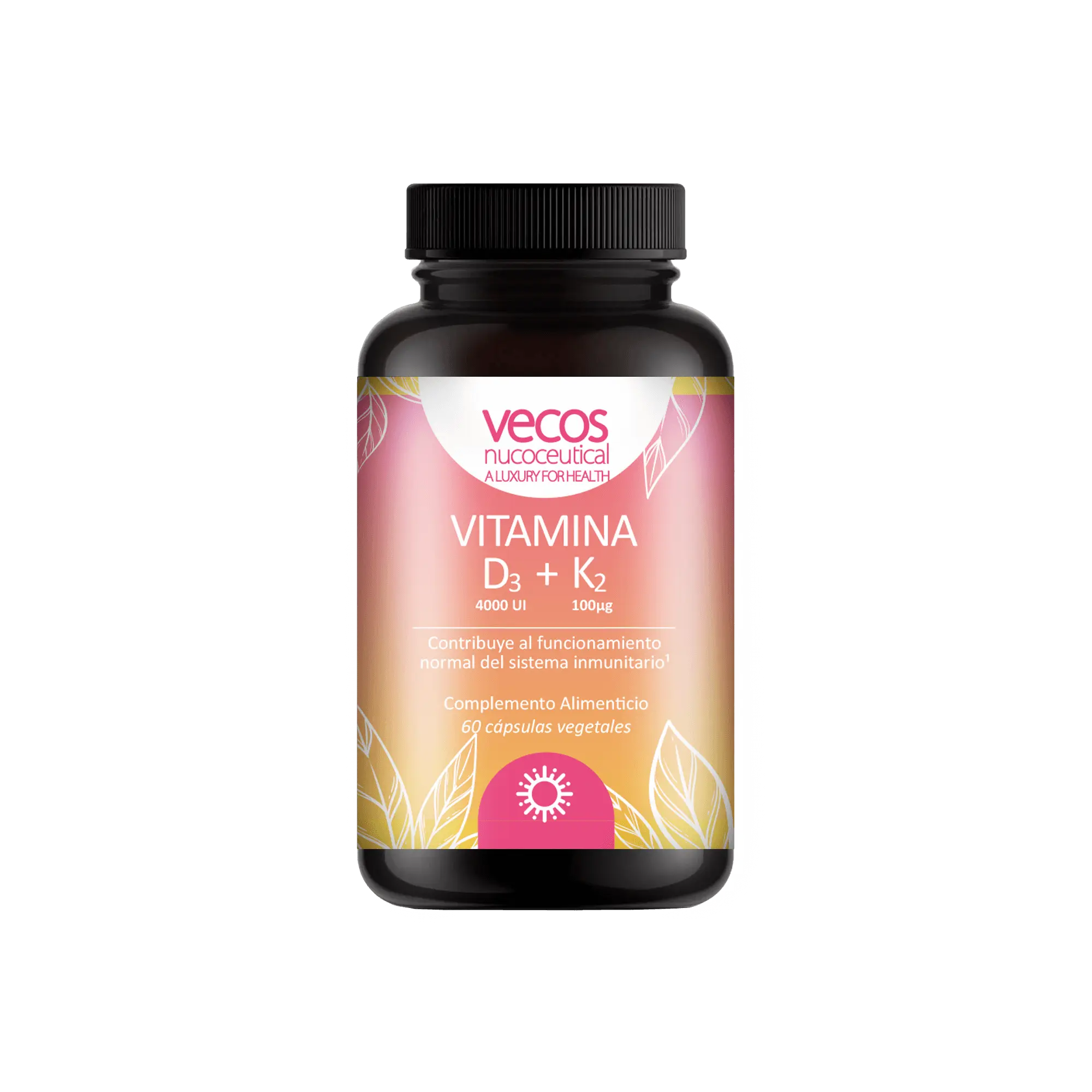 Vitamina D3+K2 de Vecos es un complemento alimenticio en cápsulas vegetales con el que contribuirás al funcionamiento normal del sistema inmunitario, gracias a la Vitamina D3, y al mantenimiento de los huesos en condiciones normales, gracias a la Vitamina K2.